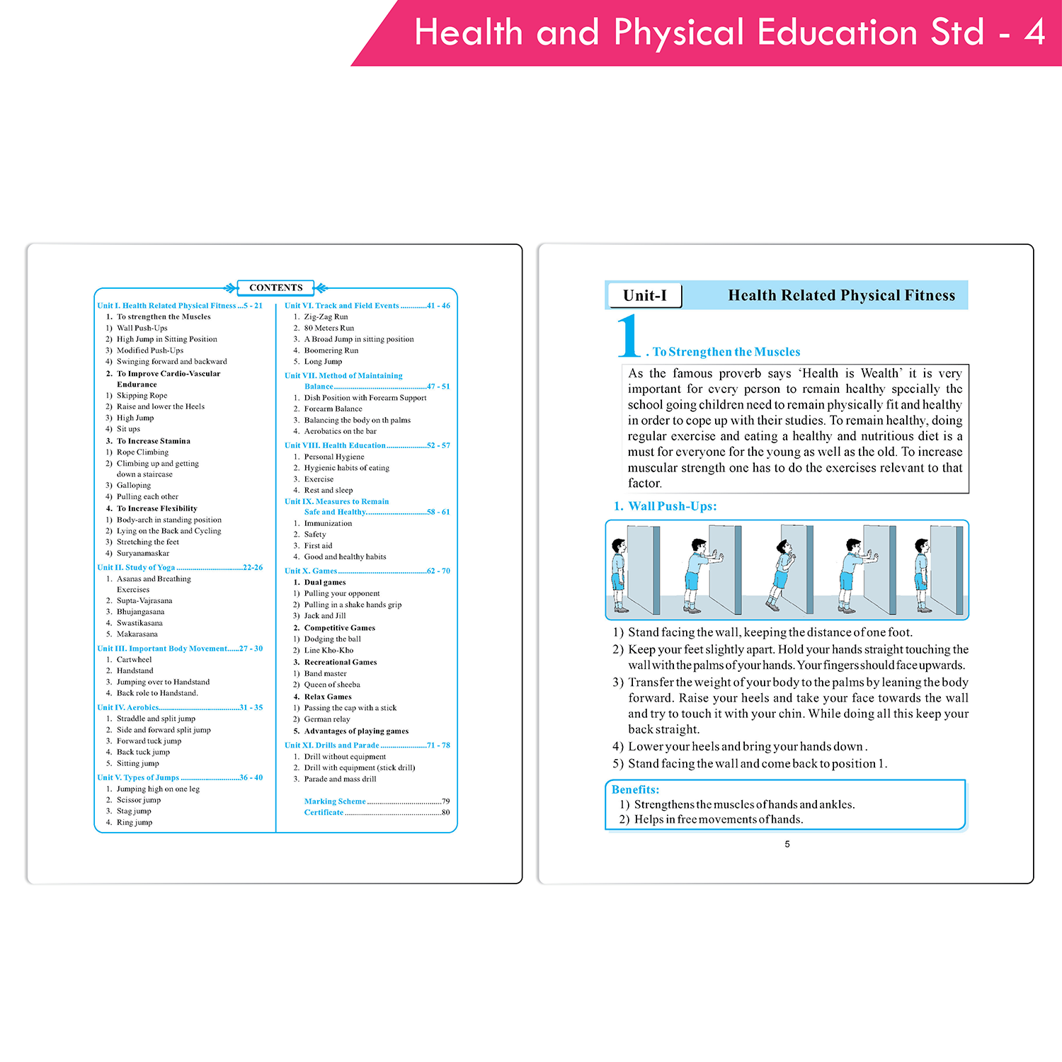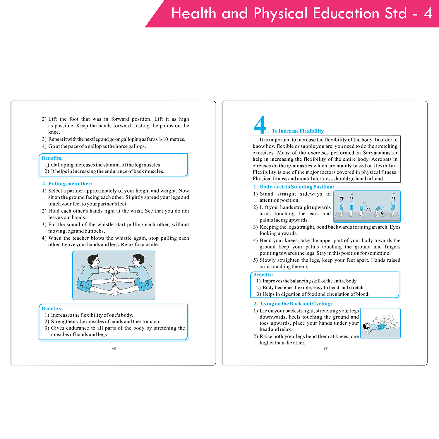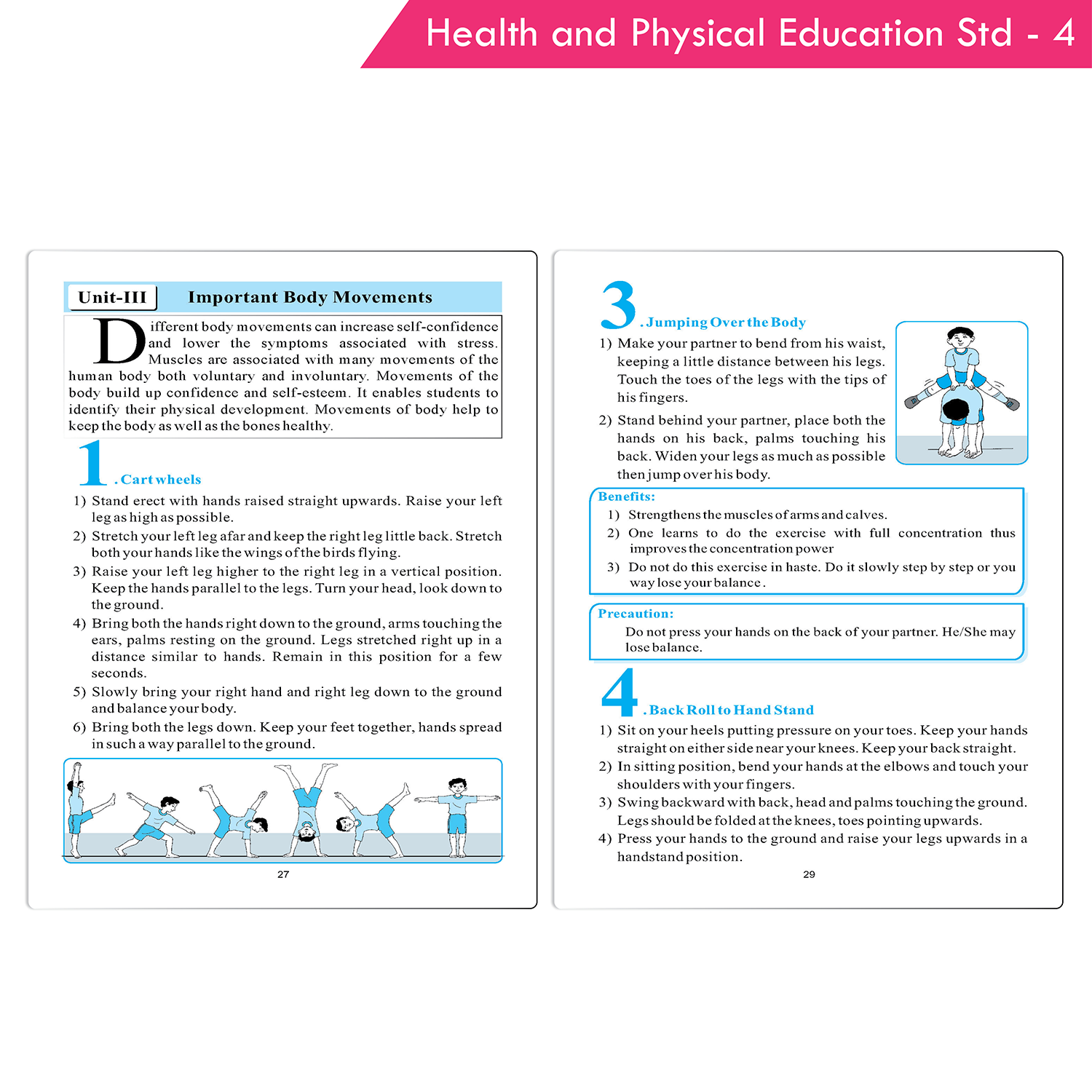 Health and Physical Education Standard – 4 book presents, as Physical Education and Health Education are inter-related, much importance is given to health and hygiene. ‘A Healthy Body houses a Healthy Mind’, so the saying goes on and it points out to a fundamental truth. For a Healthy and well-nourished body, exercises are very important. In fact for a strong body and a healthy mind, a complete and comprehensive knowledge of Physical Education is the need of today. Keeping this in mind and giving due consideration to the new syllabus set by the Education Board, this book has been carefully designed.
