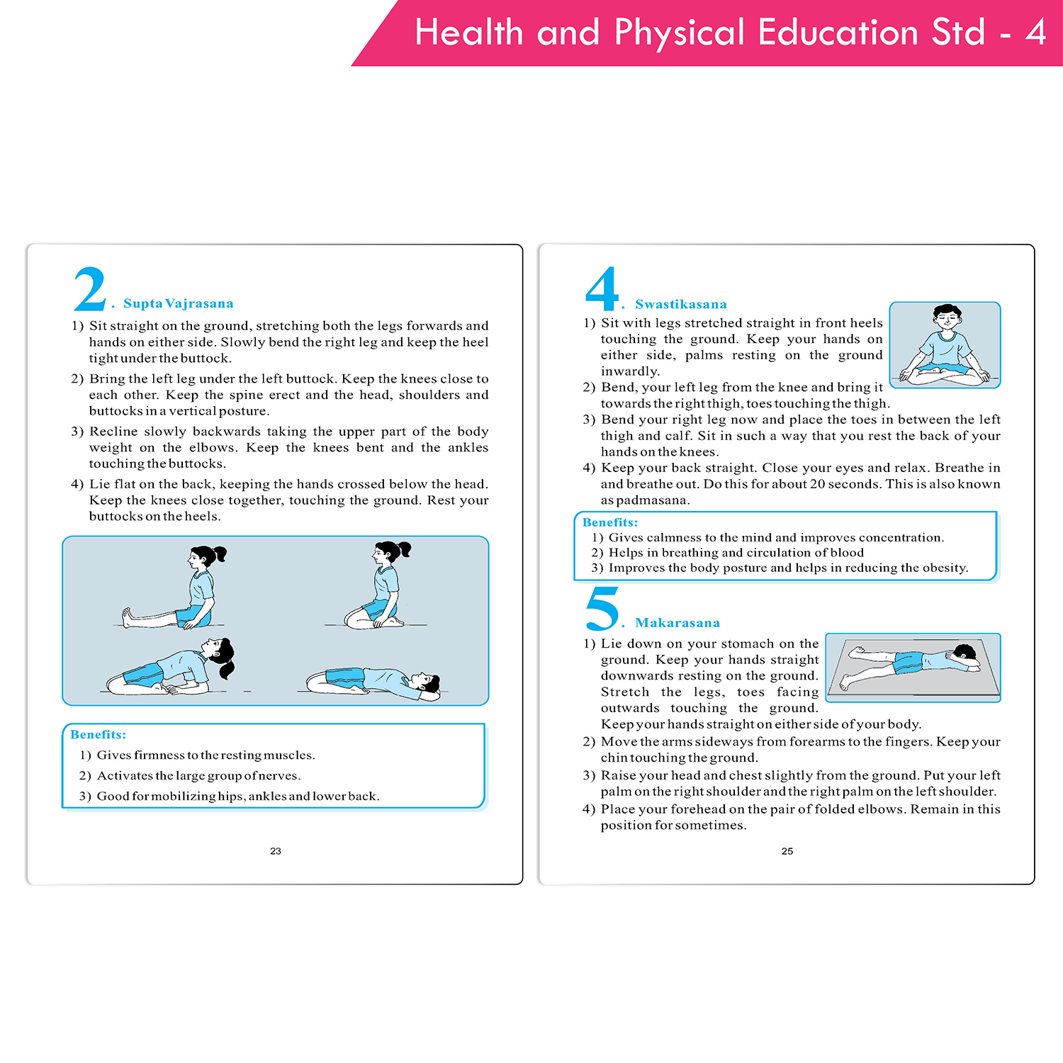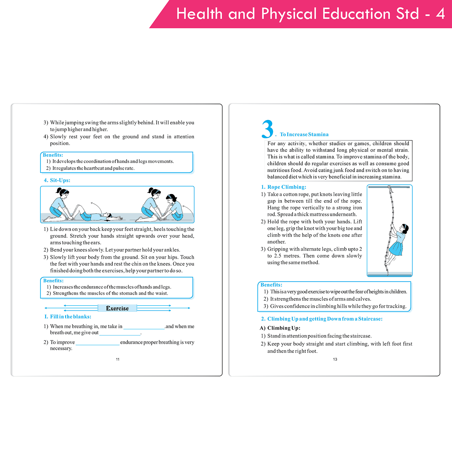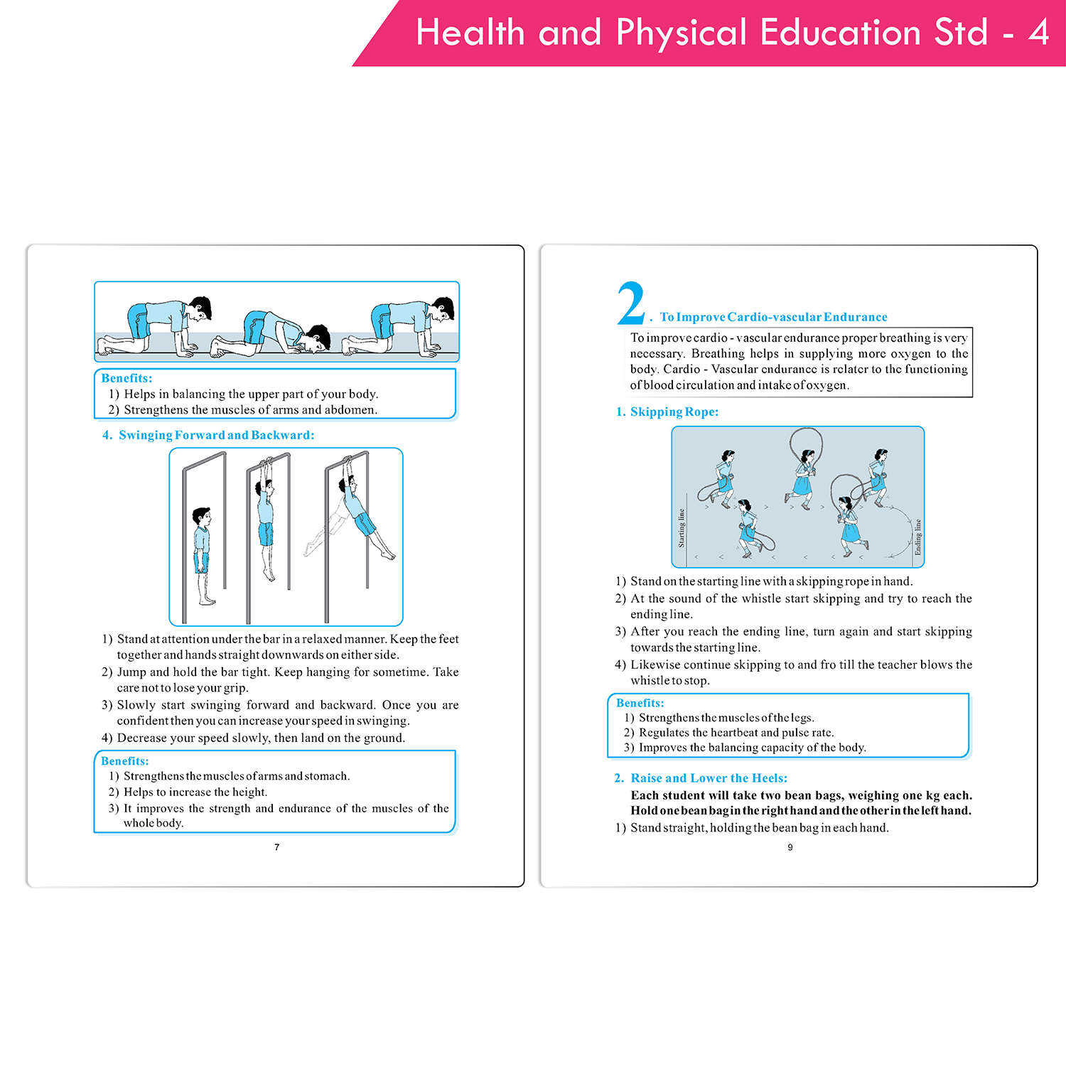 Health and Physical Education Standard – 4 book presents, as Physical Education and Health Education are inter-related, much importance is given to health and hygiene. ‘A Healthy Body houses a Healthy Mind’, so the saying goes on and it points out to a fundamental truth. For a Healthy and well-nourished body, exercises are very important. In fact for a strong body and a healthy mind, a complete and comprehensive knowledge of Physical Education is the need of today. Keeping this in mind and giving due consideration to the new syllabus set by the Education Board, this book has been carefully designed.