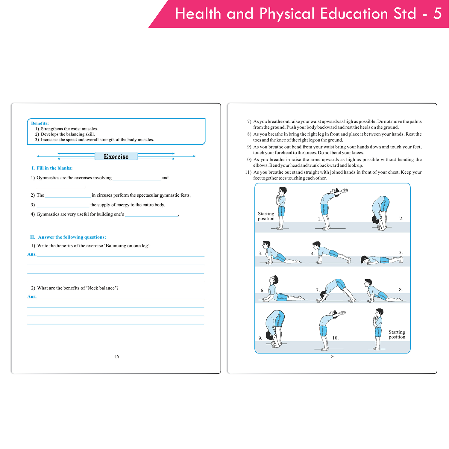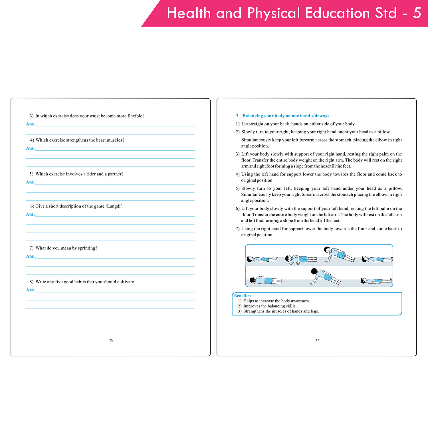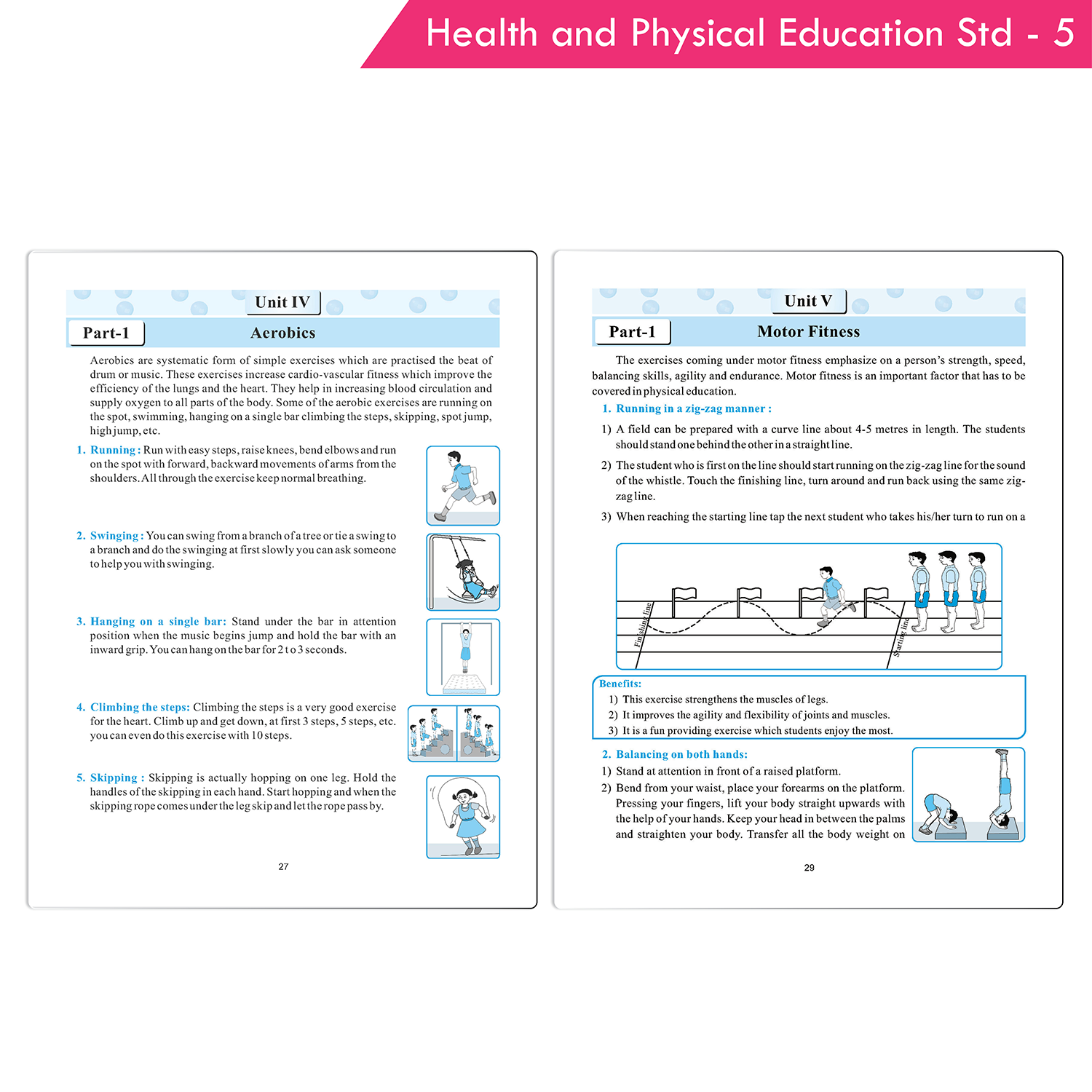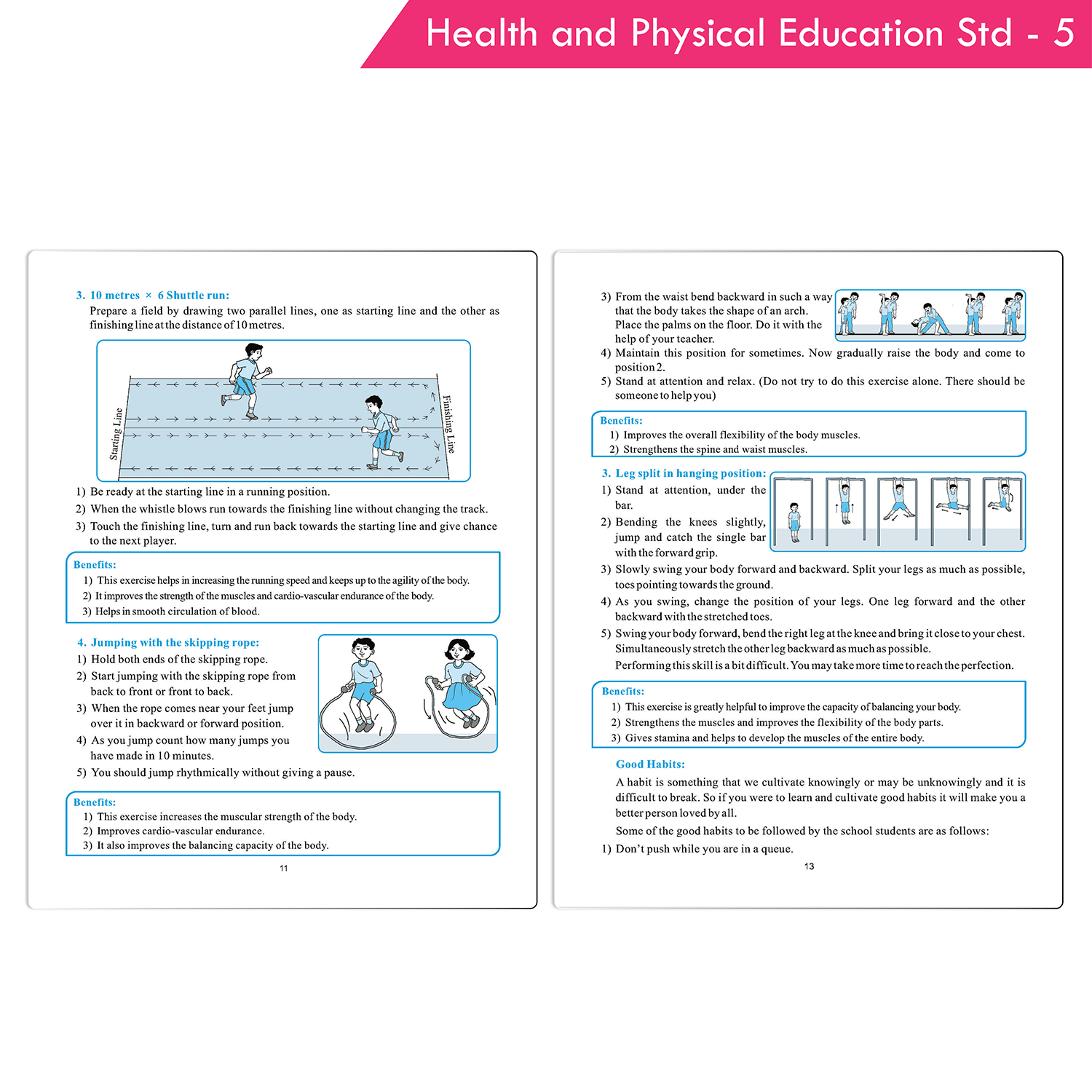 Health and Physical Education Standard – 5 book presents, as Physical Education and Health Education are inter-related, much importance is given to health and hygiene. ‘A Healthy Body houses a Healthy Mind’, so the saying goes on and it points out to a fundamental truth. For a Healthy and well-nourished body, exercises are very important. In fact for a strong body and a healthy mind, a complete and comprehensive knowledge of Physical Education is the need of today. Keeping this in mind and giving due consideration to the new syllabus set by the Education Board, this book has been carefully designed.