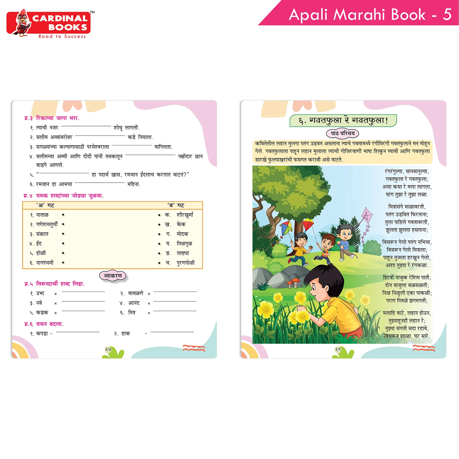 Cardinal Books Aapli Marathi Pathyapustak 5 is a creative Marathi Learning Book that brings poems, stories, and comprehension together in one place. Each chapter builds language skills through engaging lessons designed to match students’ growing abilities. Children learn to read with understanding, think creatively, and express ideas confidently.