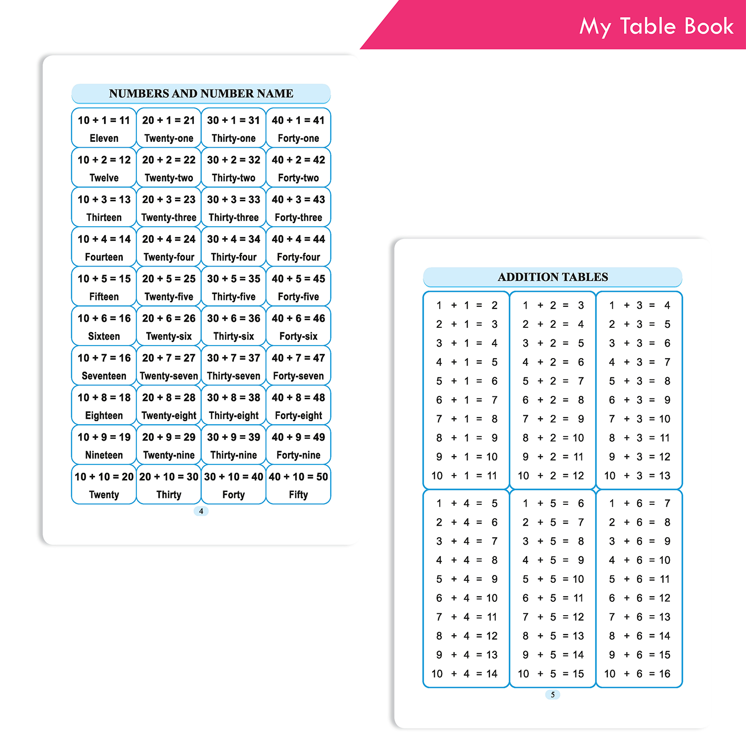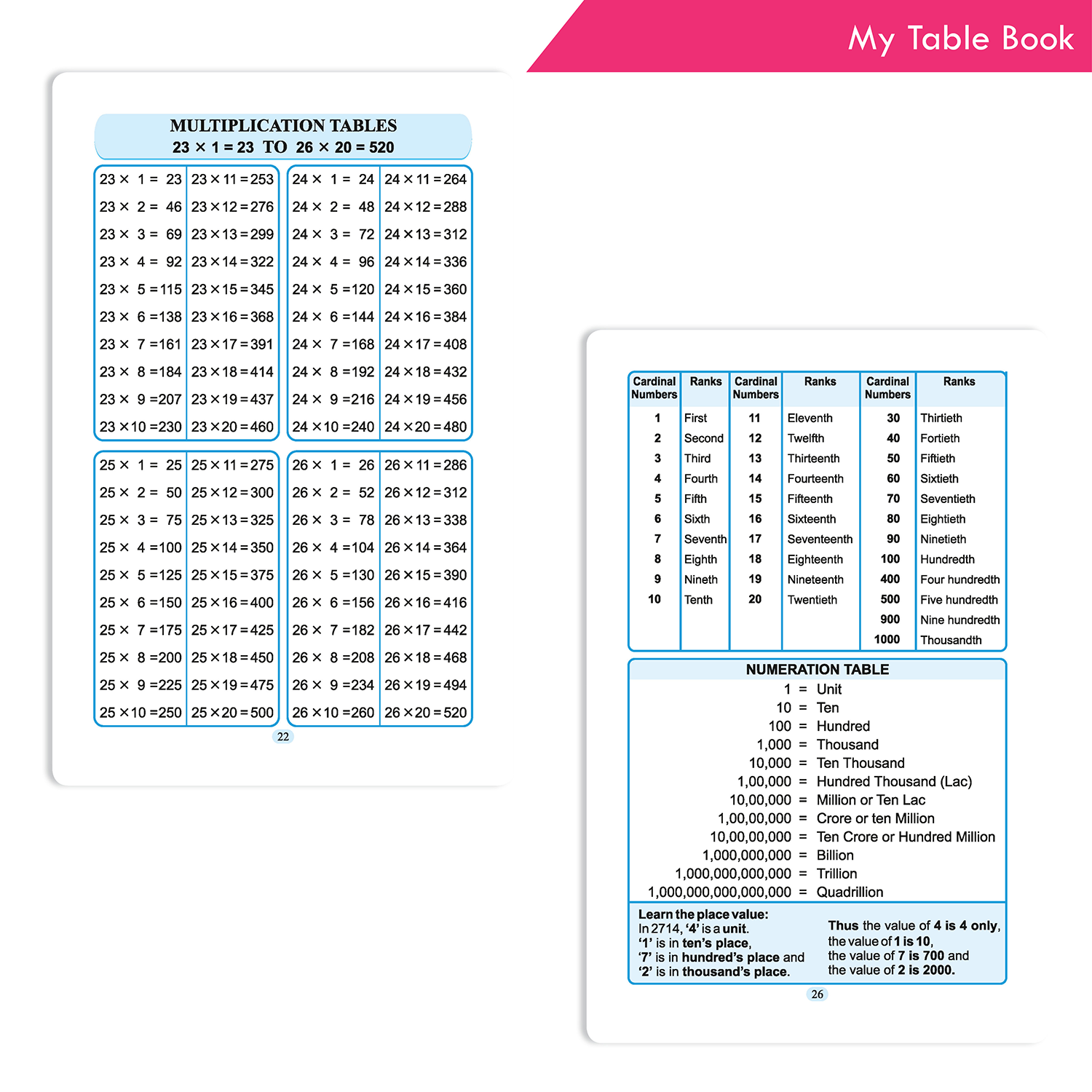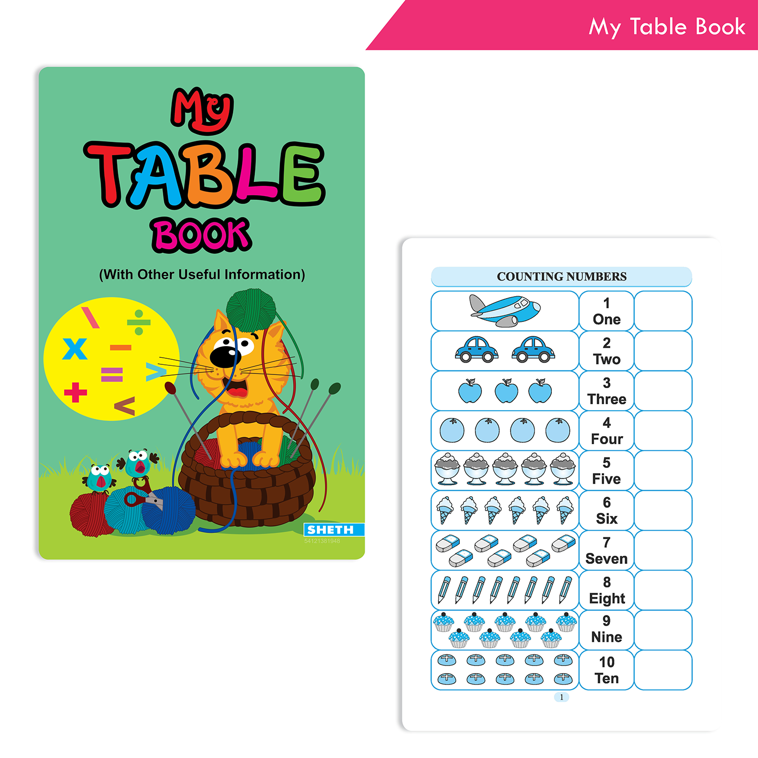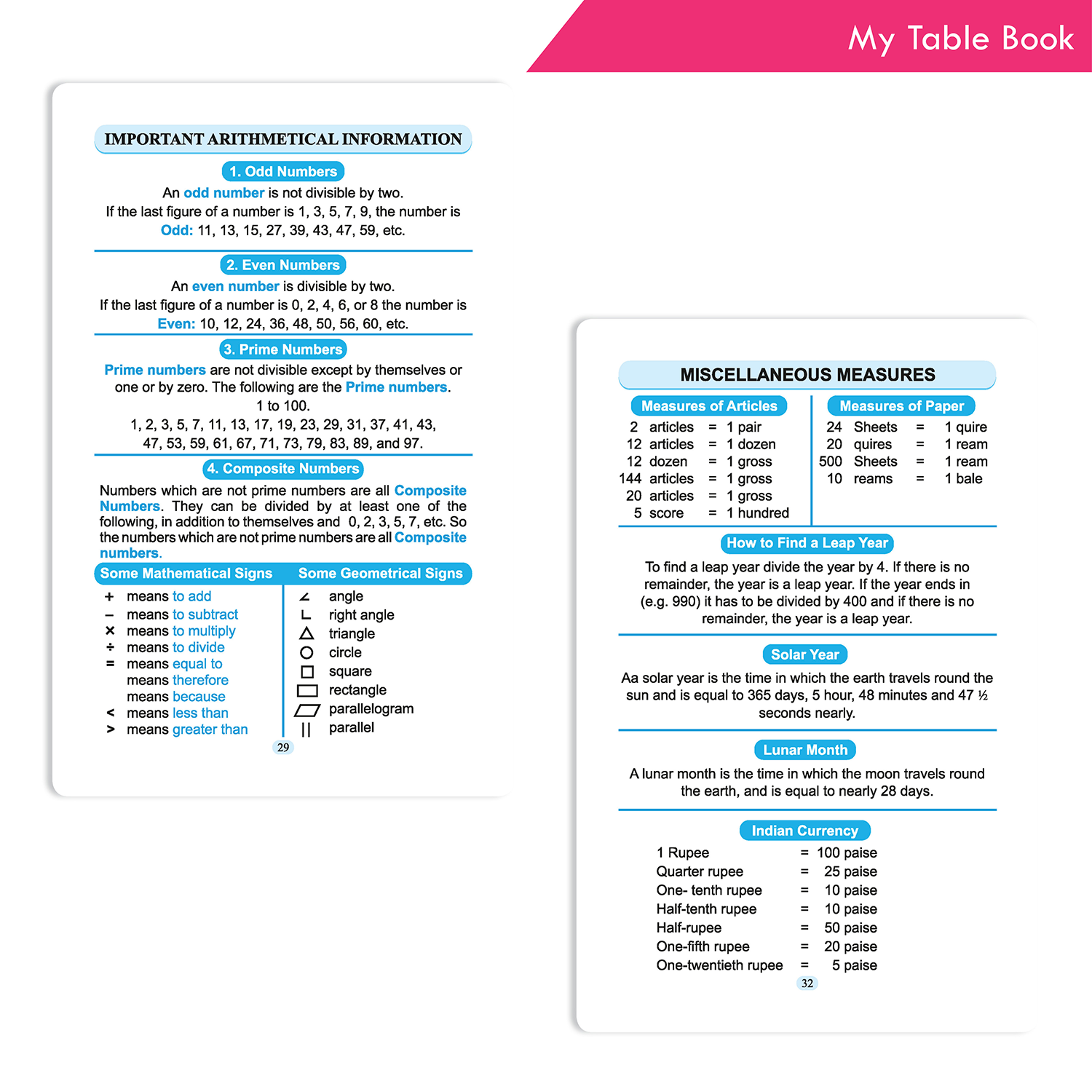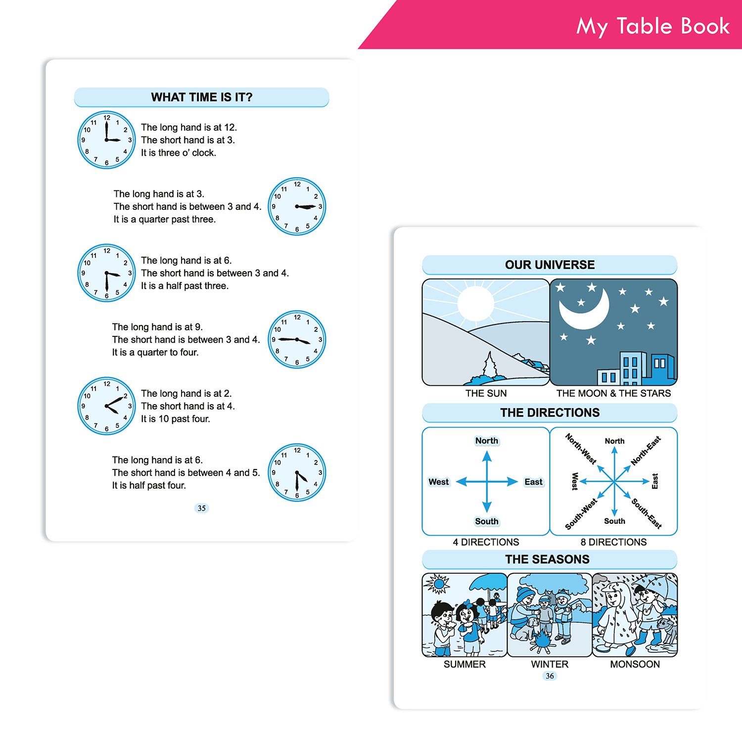 “My Table Book” is a vibrant resource designed to introduce young children to fundamental math concepts. It covers essential topics such as multiplication tables (0-20), Roman numerals (1-100), numeration (Units to Billions), and key arithmetical concepts (Odd, Even, Prime, Composite Numbers). The book also includes practical information on Metric Measures, Indian Currency, Time, Calendar, Days of the Week, Directions, and Our Universe. Engaging and educational, this book makes learning math enjoyable and effective, making it an excellent tool for both classroom and home use.