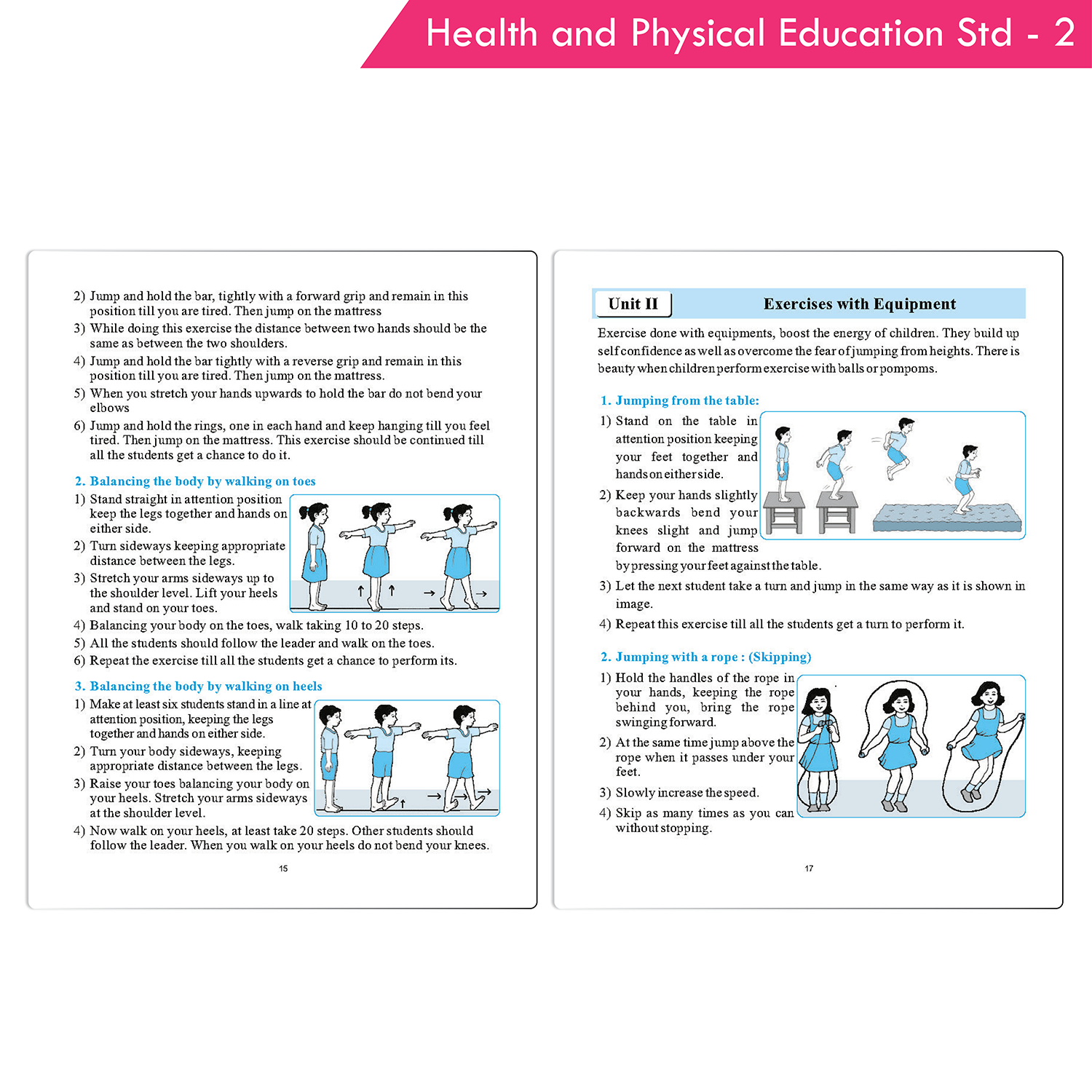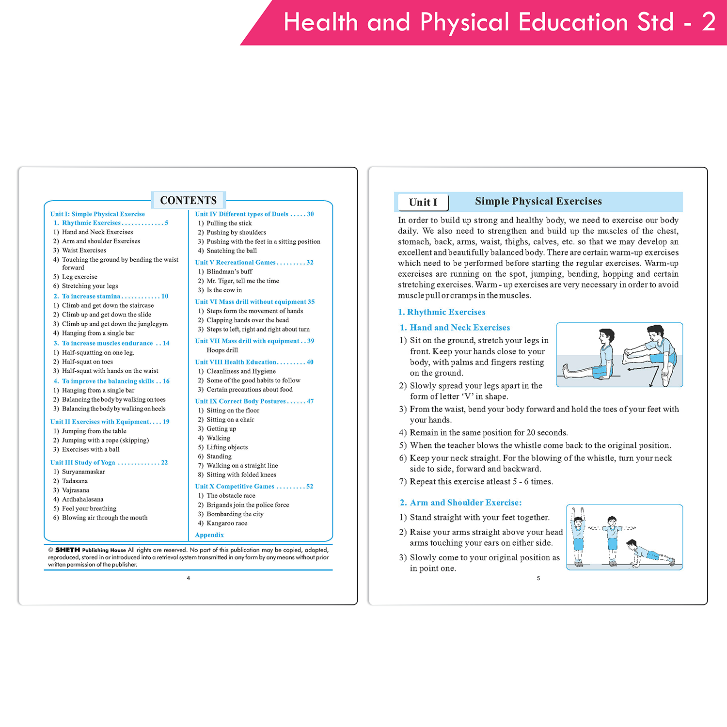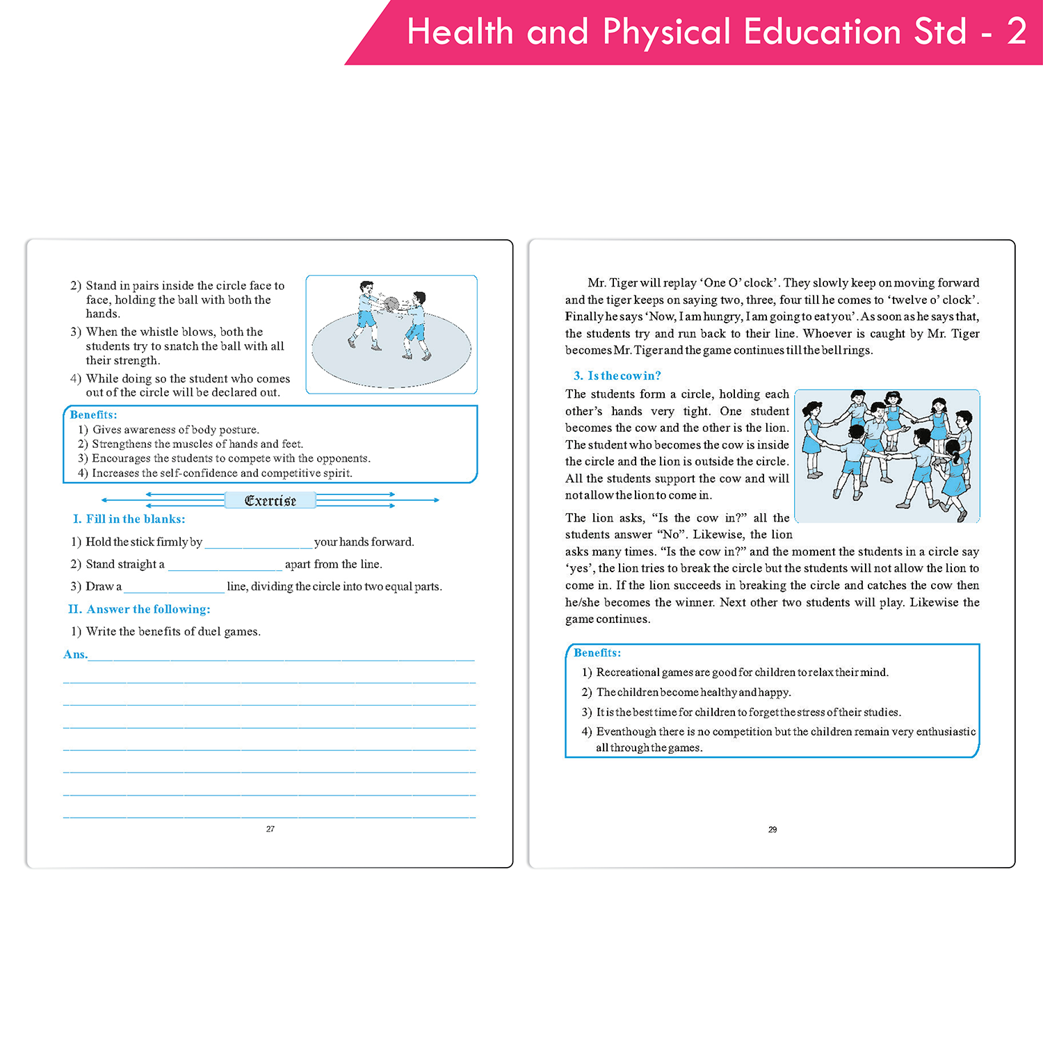 Health and Physical Education Standard – 2 book presents, as Physical Education and Health Education are inter-related, much importance is given to health and hygiene. ‘A Healthy Body houses a Healthy Mind’, so the saying goes on and it points out to a fundamental truth. For a Healthy and well-nourished body, exercises are very important. In fact for a strong body and a healthy mind, a complete and comprehensive knowledge of Physical Education is the need of today. Keeping this in mind and giving due consideration to the new syllabus set by the Education Board, this book has been carefully designed.