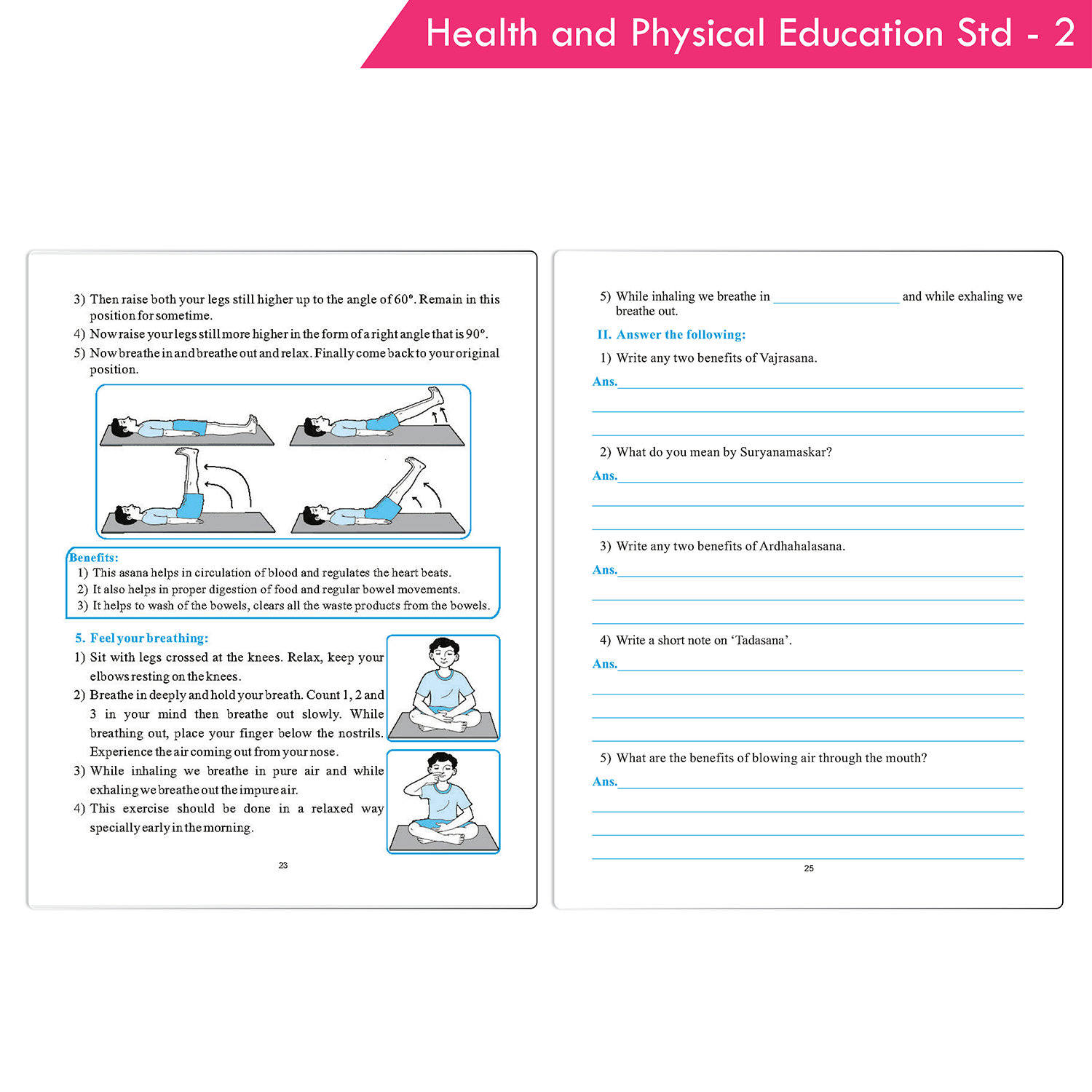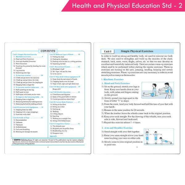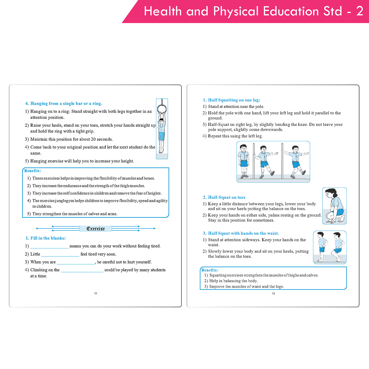 Health and Physical Education Standard – 2 book presents, as Physical Education and Health Education are inter-related, much importance is given to health and hygiene. ‘A Healthy Body houses a Healthy Mind’, so the saying goes on and it points out to a fundamental truth. For a Healthy and well-nourished body, exercises are very important. In fact for a strong body and a healthy mind, a complete and comprehensive knowledge of Physical Education is the need of today. Keeping this in mind and giving due consideration to the new syllabus set by the Education Board, this book has been carefully designed.