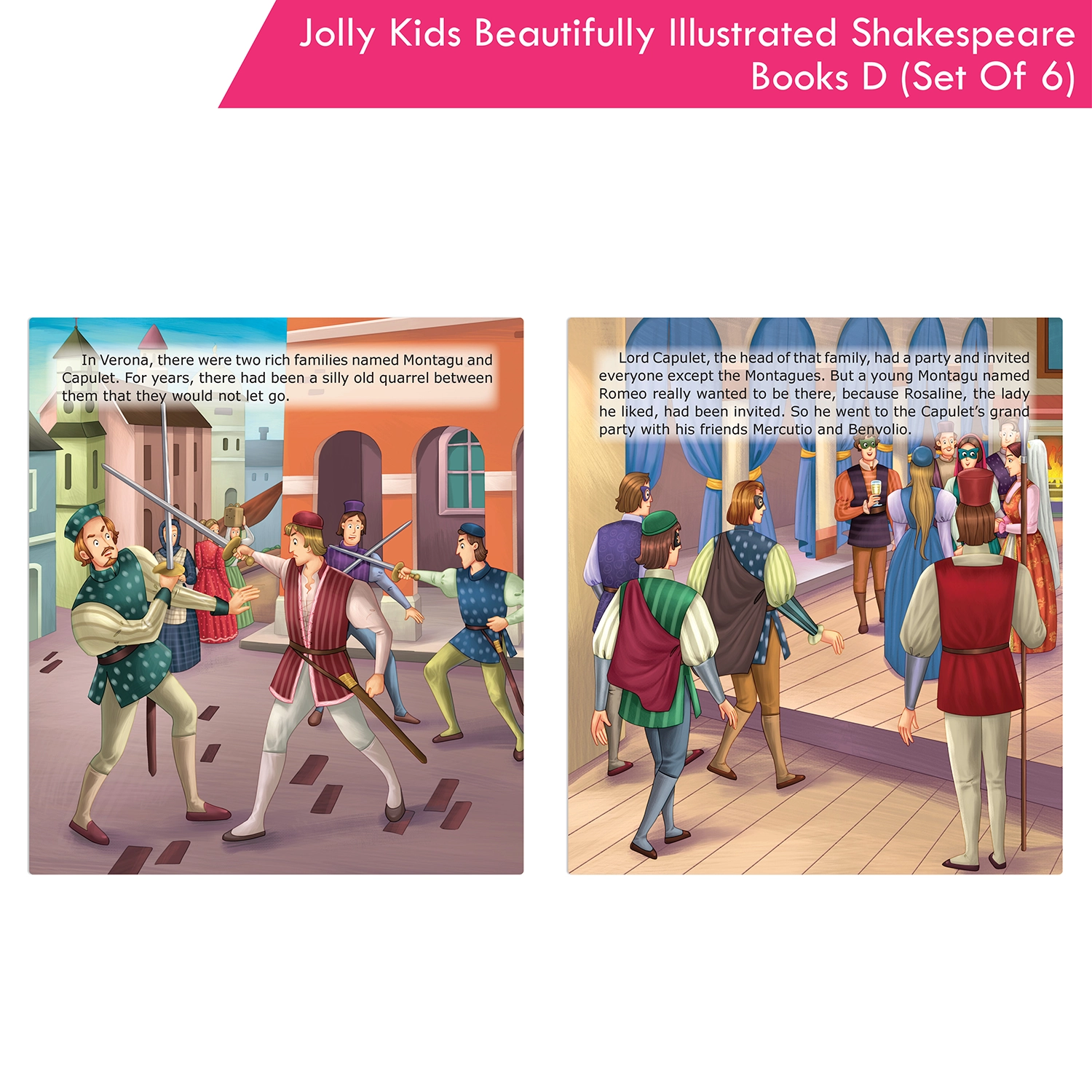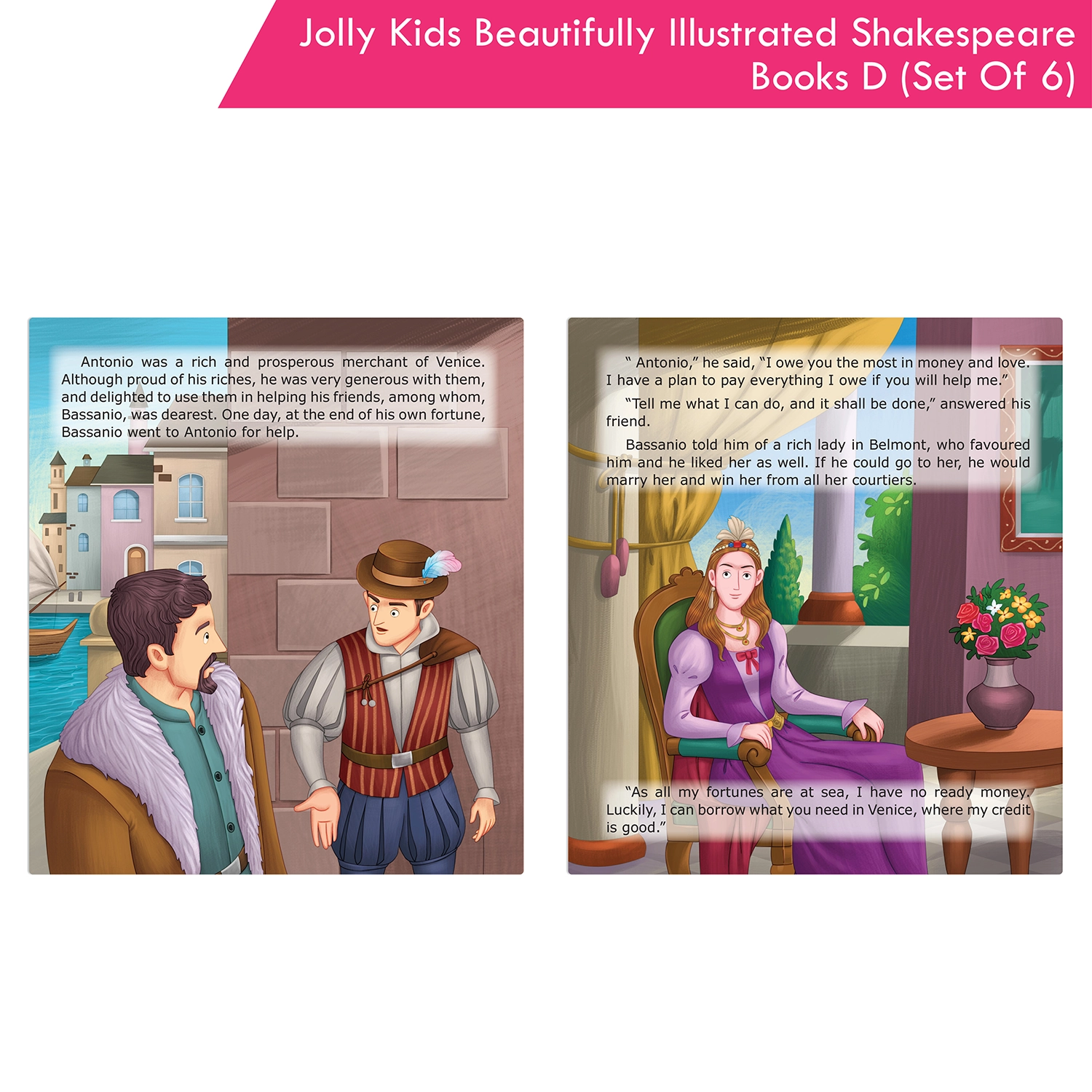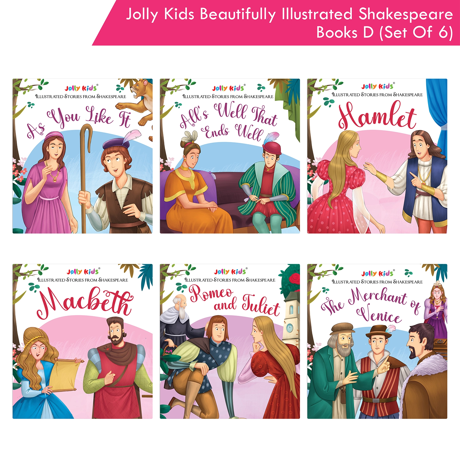 Introducing the “Shakespeare for Young Minds: Jolly Kids’ Illustrated Stories D Combo Set,” a literary journey for young readers aged 6-12. This comprehensive collection features six iconic plays: As You Like It, All’s Well That Ends Well, Hamlet, Macbeth, Romeo and Juliet, and The Merchant of Venice. Each story is designed to strike the perfect balance between educational depth and age-appropriate storytelling, making it suitable for various reading levels within the target age range. The captivating illustrations vividly bring Shakespeare’s characters and imaginary world to life, fostering a deeper understanding and igniting creative imaginations. Whether for independent reading, family exploration, or classroom use, this combo set adapts seamlessly to various learning environments, empowering your child with a deep appreciation for literature. Engaging with Shakespeare at an early age builds confidence and fosters a lifelong love for reading. The set encourages family bonding as you explore the magic of Shakespeare together. Choose the “Shakespeare for Young Minds” Combo Set to provide your child with more than just books—it’s an immersive literary experience that sparks curiosity, nurtures cultural understanding, and fosters a lifelong love for the written word.