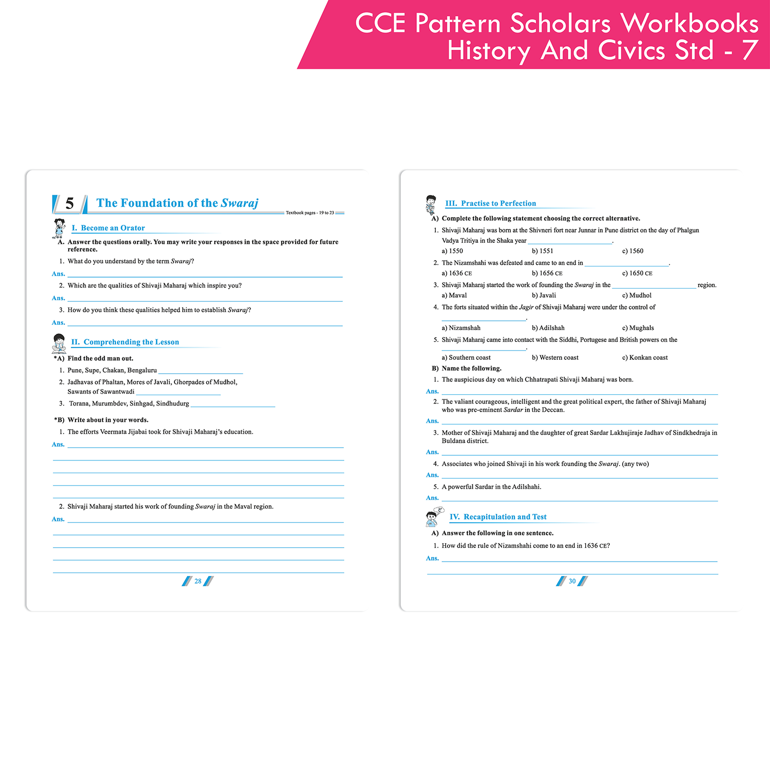 Our workbook ‘History and Civics for Standard 7 based on CCE pattern’ is designed to realise the above objectives. Through a variety of tools, we have tried to shift emphasis from mere testing to holistic learning. It aims at ensuring that the students bid adieu to rote learning, cramming and relentless mugging to joyful learning.
