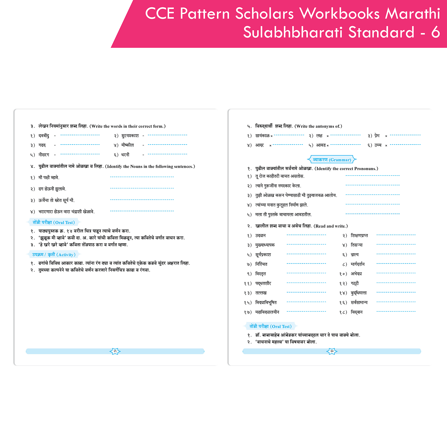 Our Workbook ‘Nigam Marathi Workbook for Std 6’ is designed to realise the following objectives. Through a variety of tools, we have tried to shift emphasis from mere testing to holistic learning. It aims at ensuring that the students bid adieu to rote learning, cramming and relentless mugging to joyful learning. Considering both kinds of evaluation we have divided chapters into sections with specific purposes. Teachers have all the freedom to modify the section as per the requirement to evaluate the students.